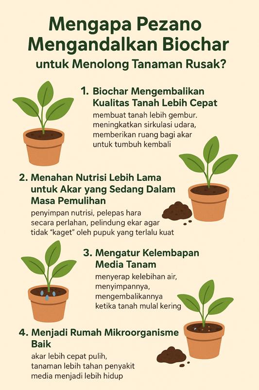 Pezano mengandalkan biochar karena bahan ini bukan sekadar campuran tanah, tetapi alat pemulih yang mempengaruhi struktur, nutrisi, kelembapan, dan kesehatan mikroba tanah.